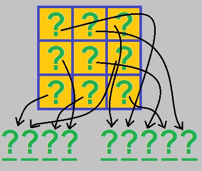 Clues, in no particular order, will be provided for the six 3-letter words. A seventh clue will be given for the 9-letter word formed from all letters in the grid: